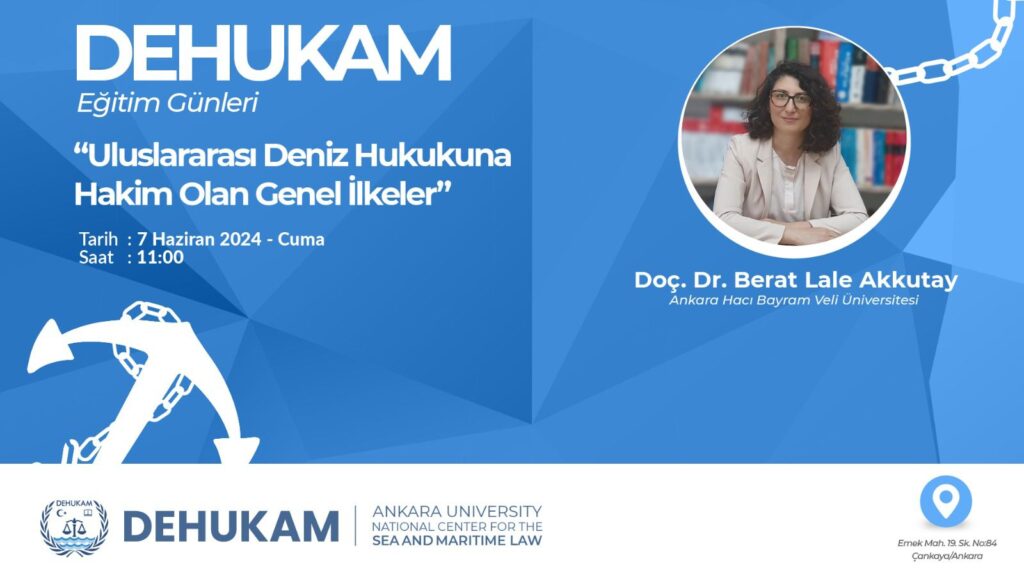 Ankara Hacı Bayram Veli Üniversitesi Hukuk Fakültesi Kamu Hukuku Bölümü Milletlerarası Hukuk Anabilim Dalı Öğretim Üyesi Doç. Dr. Berat Lale Akkutay, 7 Haziran 2024 Cuma günü DEHUKAM personeline “Uluslararası Deniz Hukukuna Hakim Olan Genel İlkeler” konulu eğitim verdi. Eğitim programı kapsamında, Uluslararası Hukuk ve Deniz Hukuku kavramları çerçevesinde, Uluslararası Deniz Hukuku ilkelerini ve Deniz Hukuku […]